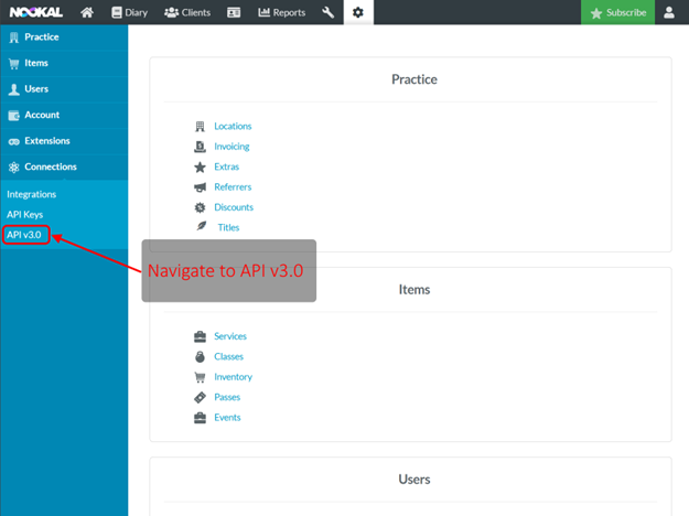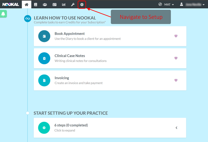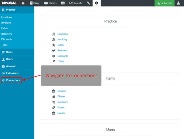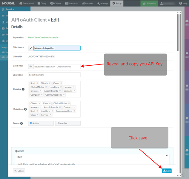 Select your integration as ‘Nookal’ and paste your API key generated earlier in the Nookal web portal, into the ‘API Key’ field.