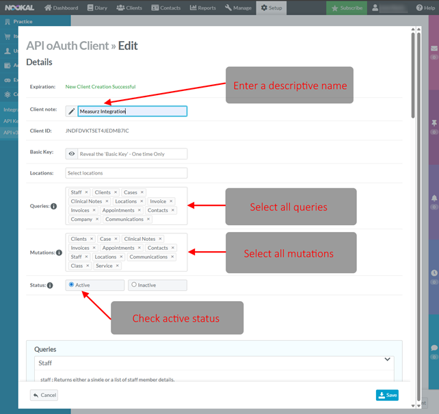Enter a descriptive name such as “Measurz Integration”, in the ‘Client note:’ field.